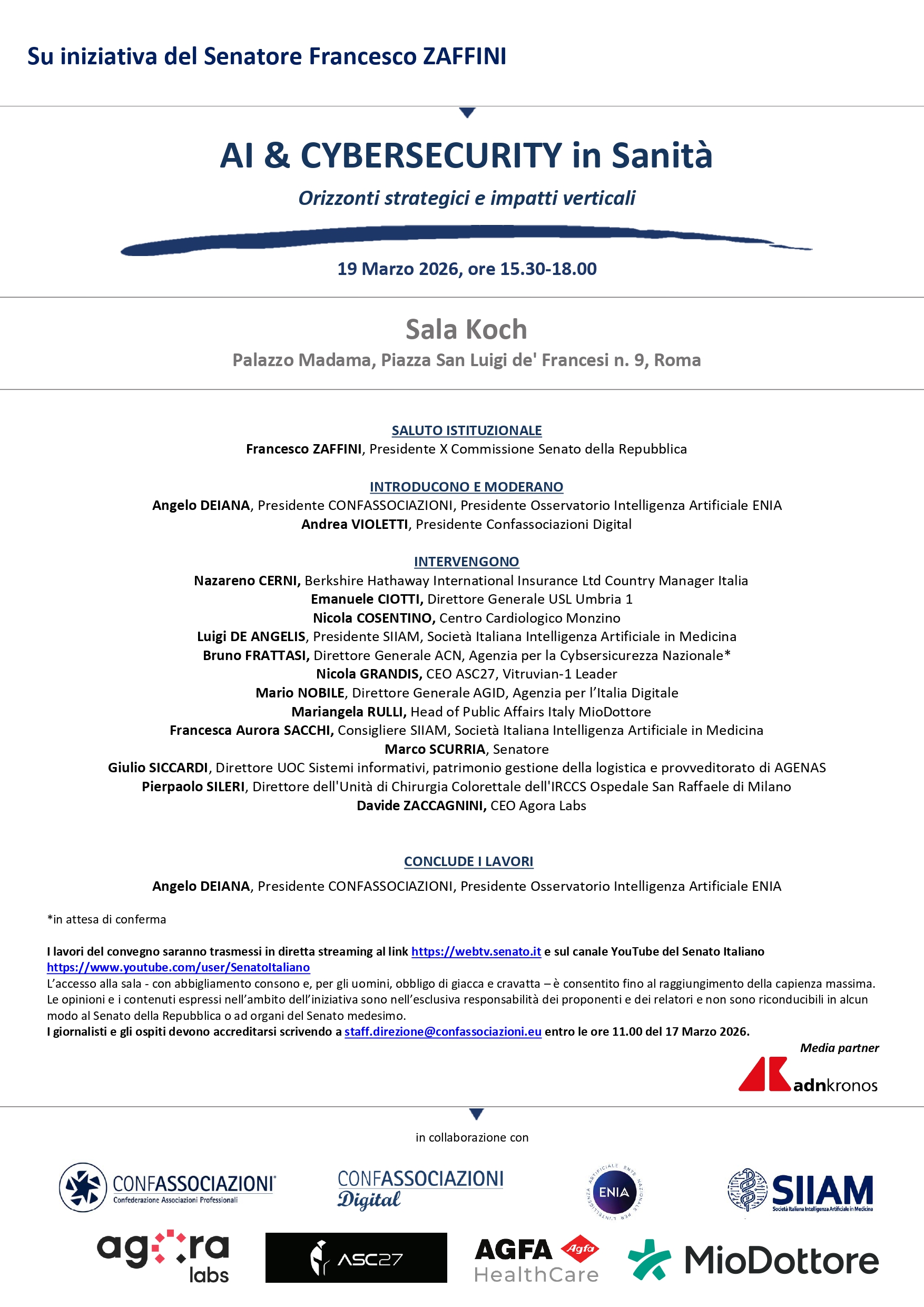 Su iniziativa del Senatore Francesco Zaffini, la conferenza “AI E CYBERSECURITY IN SANITA’. Orizzonti strategici e impatti verticali” è organizzata da Confassociazioni Digital e CONFASSOCIAZIONI in collaborazione con ENIA, SIIAM, agora labs, ASC27, AGFA HealthCare e MIODOTTORE.
