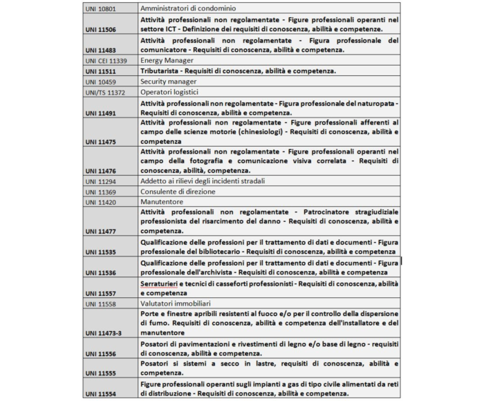 “Il primo numero, deciso congiuntamente con il Presidente Angelo Deiana, è finalizzato a dare una semplice informazione su tutte le norme relative alla certificazione delle professioni emesse, a oggi, da UNI. Mi permetto di fare una piccola puntualizzazione: l’elenco che viene pubblicato qui non è completo e non riguarda solo le norme di certificazione delle professioni. Questo particolare, per quanto strano, è facilmente comprensibile se ritorniamo alla norma, la Legge 4/2013, entrata in vigore nel gennaio 2013. Quindi due anni fa circa. Se guardiamo invece l’attività normativa relativa la certificazione delle persone l’anno è decisamente antecedente il 2013. UNI sul proprio sito, nel riferire dell’operato della Commissione U08 (che vi ricordo essere la commissione specifica per le professioni non regolamentate) richiama un elenco di norme specifiche afferenti la Legge 4, ma per l’appunto, come ho appena scritto, ci sono norme antecedenti riguardanti la certificazione delle persone. Un esempio importante è la norma UNI 10801 per gli amministratori condominiali e immobiliari pubblicata nel 1998. Questa norma, attualmente, non rientra nell’elenco di UNI inviato al Ministero sia perché antecedente alla Legge 4 sia perché non in linea con la CEN 14 (la linea guida definita da UNI per la redazione di norme di certificazione delle professioni). Ma nulla vieta di pensare, anzi è fortemente probabile, che presto possa partire un gruppo di lavoro per il suo aggiornamento. Ancora un piccolo campanello rosso. Potrebbero esserci anche norme di certificazione delle persone sviluppate a seguito della pubblicazione della Legge 4, non incluse, però, nell’elenco che UNI invia al Ministero. Questa eventualità può esserci o se la norma si riferisce a professioni riservate o se non c’è una dichiarata riconducibilità alla Legge 4. Da ricordare anche che la Commissione U08 non è l’unica commissione che sviluppa norme di certificazione delle professioni. UNI ragiona per ambiti di competenza tecnica per cui se arriva una richiesta di norma di certificazione per una figura professionale strettamente legata, ad esempio, alla sicurezza, lo sviluppo della norma avverrà in commissione sicurezza, luogo deputato ad avere le migliori competenze per definire il profilo professionale specifico. Per concludere, dopo questo sintetico quadro sulle norme in elenco e norme non in elenco, vi mostro una tabella dove in grassetto ci sono le norme riconducibili alla legge 4/2013. Sulle altre UNI non dà alcun dettaglio o per un mancato aggiornamento dell’elenco o perché non previste dalla Legge 4”. | |
