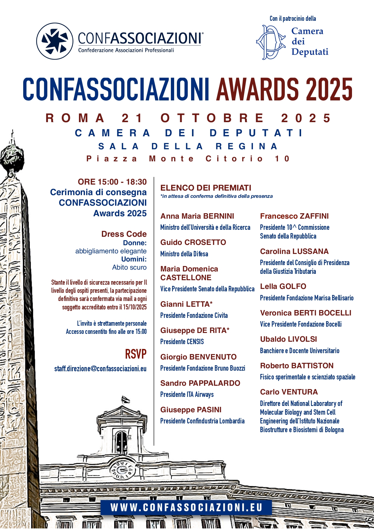 Roma, 1° ottobre 2025 – “I CONFASSOCIAZIONI Awards, i nostri premi etici, valoriali e istituzionali, celebrano la loro Quarta Edizione il 21 ottobre 2025 presso la Sala della Regina di Palazzo Monte Citorio con il patrocinio della Camera dei Deputati e della sua Presidenza”. Lo ha dichiarato in una nota il Presidente di CONFASSOCIAZIONI, Angelo DEIANA.
