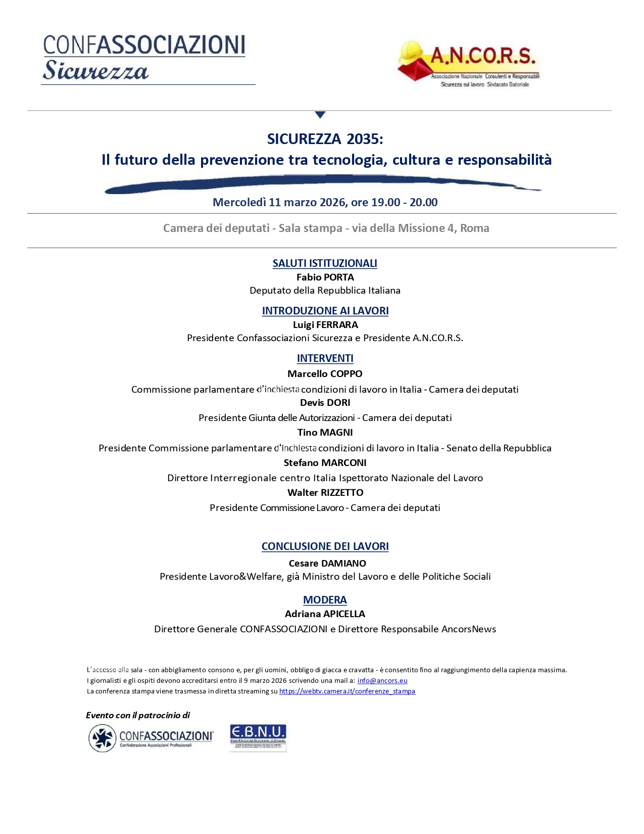 Roma, 3 marzo 2026 – “Fondamentale definire le traiettorie della prevenzione nei prossimi dieci anni puntando su innovazione tecnologica, evoluzione culturale e assunzione di responsabilità. Ne parleremo il prossimo 11 marzo presso la Sala stampa della Camera dei deputati con la conferenza “Sicurezza 2035: Il futuro della prevenzione tra tecnologia, cultura e responsabilità”. Lo ha dichiarato Luigi FERRARA, Presidente A.N.CO.R.S. e Presidente Confassociazioni Sicurezza.