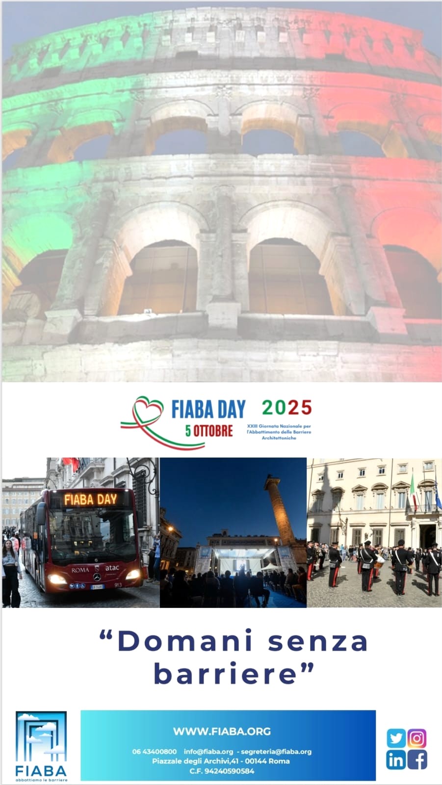 Roma, 30 settembre 2025 – La XXIII Giornata Nazionale per l’Abbattimento delle Barriere Architettoniche – Fiaba Day – il cui titolo quest’anno è Domani senza Barriere, in collaborazione con la Presidenza del Consiglio dei Ministri e il Comando Generale del Corpo delle Capitanerie di Porto – Guardia Costiera si tiene annualmente la prima domenica di ottobre (quest’anno il 5 ottobre a partire dalle ore 10.00) in Piazza Colonna a Roma e coinvolge il mondo delle Istituzioni, politico, sociale, culturale, associativo e delle imprese per sensibilizzare sull’importanza dell’inclusione e del superamento delle barriere fisiche e culturali.